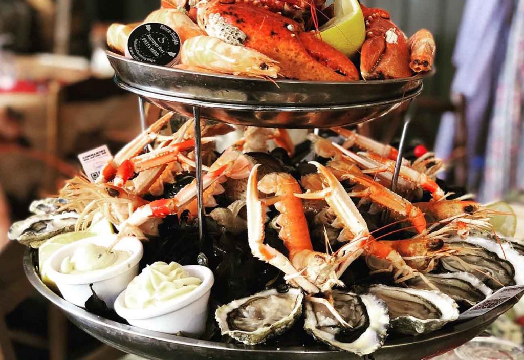 Le plateau de fruits de mer signature est servi frais, avec des huîtres charnues et des coquilles Saint-Jacques tendres.